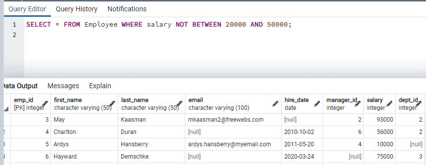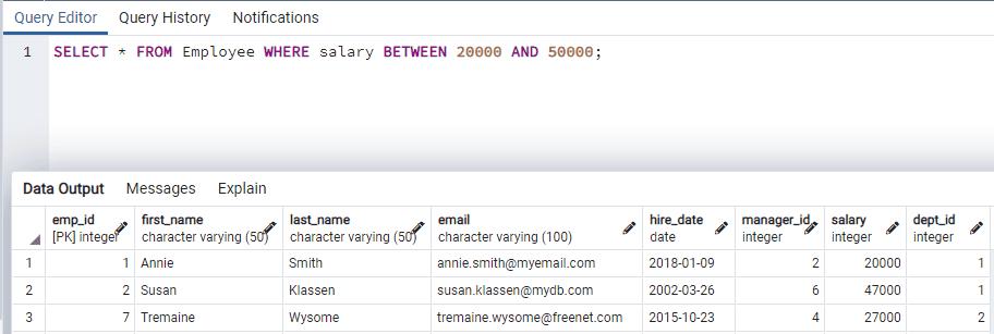 Now, let's get all employees whose salary is between 20000 and 50000. For this, we can use the BETWEEN operator with low and high values, as shown below: