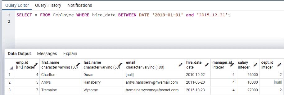 The BETWEEN operator can be used for specifying the date range in the query. The following fetches employees whose hire_date