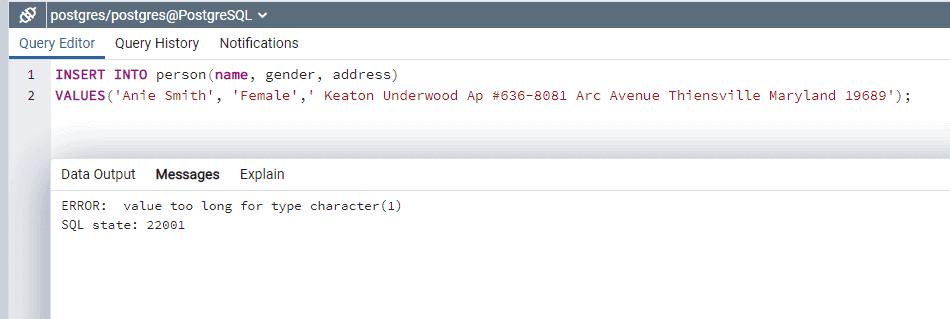 PostgreSQL clearly raises an error as the value is too large for the CHARACTER(1)