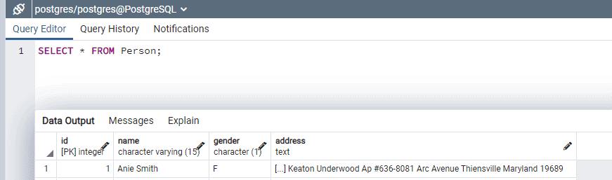 The above query result shows the data type of each column along with the data. You can see the address