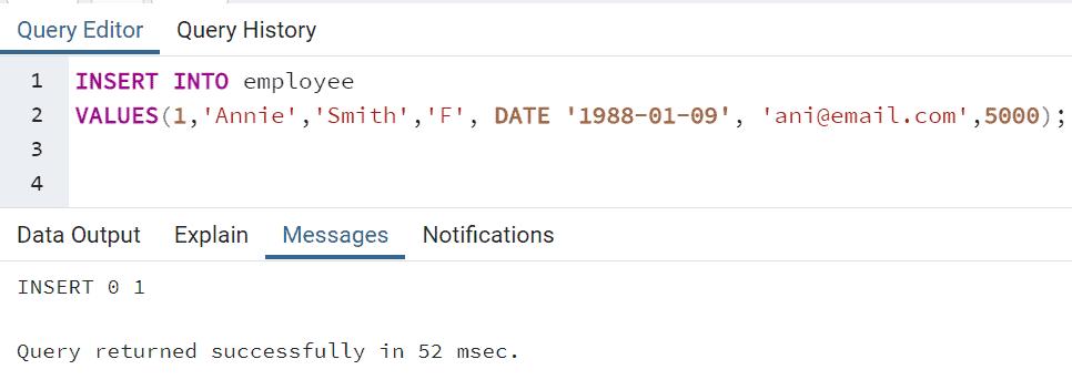 The above query will insert four rows into the employee table and display the following result in pgAdmin.