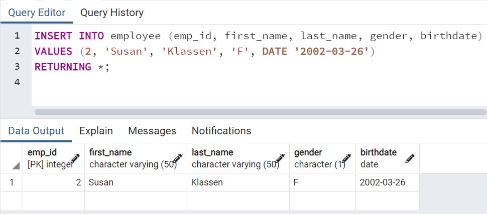 VALUES (2, 'Susan', 'Klassen', 'F', DATE '2002-03-26')