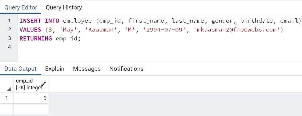 clause. Bellow will insert data to the employee table and return the newly inserted emp_id.