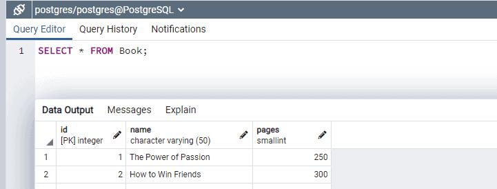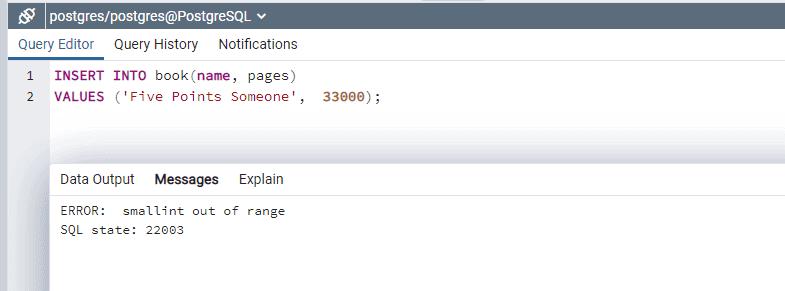 Now if you try to insert data in Book table with value of pages column beyond SMALLINT range, PostgreSQL will raise out of range error and will not allow to insert data