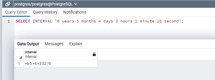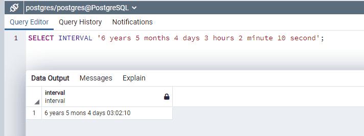 SELECT INTERVAL '6 years 5 months 4 days 3 hours 2 minute 10 second';
