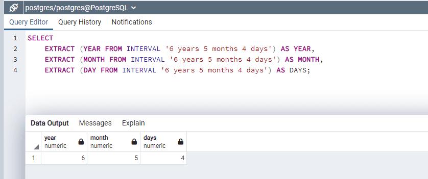 EXTRACT (YEAR FROM INTERVAL '6 years 5 months 4 days') AS YEAR,