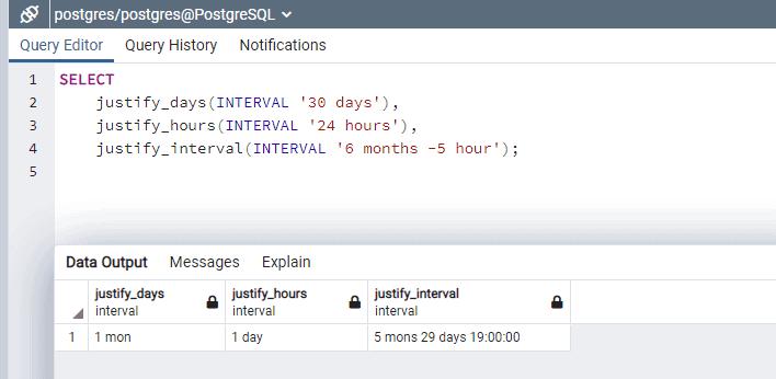 - justify_interval(): Adjusts an interval using justify_days and justify_hours. It allows you to use additional sign adjustments to adjust the interval.