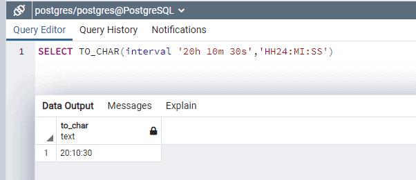 SELECT TO_CHAR(interval '20h 10m 30s','HH24:MI:SS')