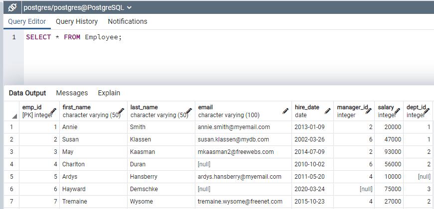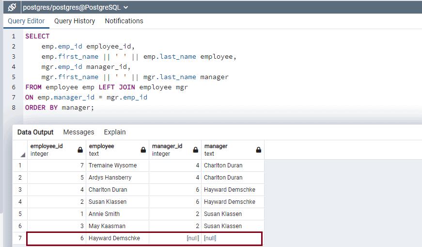 2 and 4 reports to employee id 6. Notice that employee id 6 does not have any manager assigned, he is at the top level and not shown as a row in the above query result. To show top-level employee also, use LEFT JOIN.