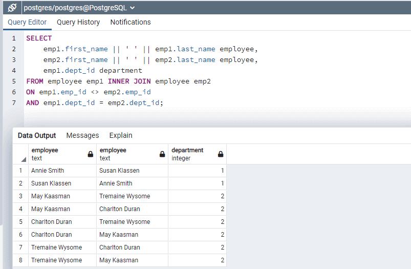 In the above query, we took the INNER JOIN of employee table with itself. We used emp1.emp_id <> emp2.emp_id