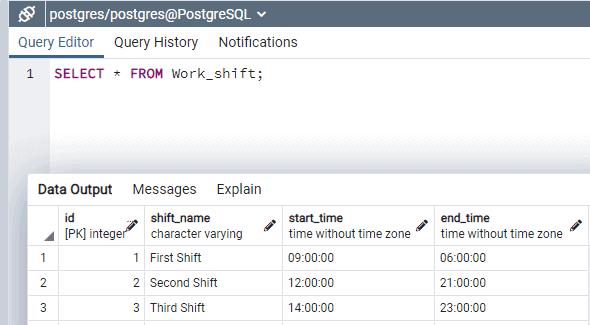 HHMMSS.pppppp -> 061134.888888Let's create a table Work_Shift with a column of the TIME type, as shown below.