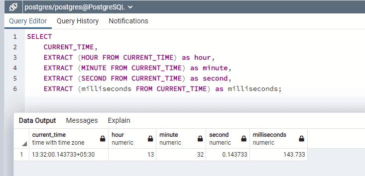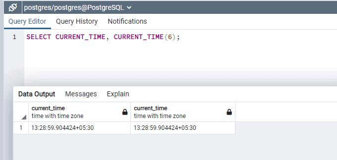 To get the current time with the time zone, use the CURRENT_TIME function. To get the current time with specific precision and with time zone use CURRENT_TIME(precision) function.