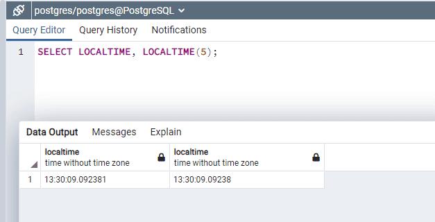 SELECT LOCALTIME, CURRENT_TIME AT TIME ZONE 'EST';