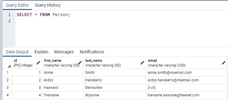 SELECT * FROM Person;The following displays the result in pgAdmin.
