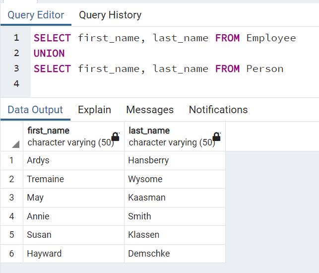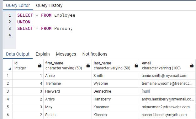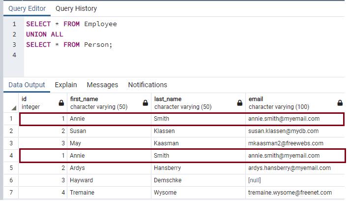 SELECT * FROM Person;The following displays the result of the above query. You can see that UNION ALL does not remove duplicate data from the result.