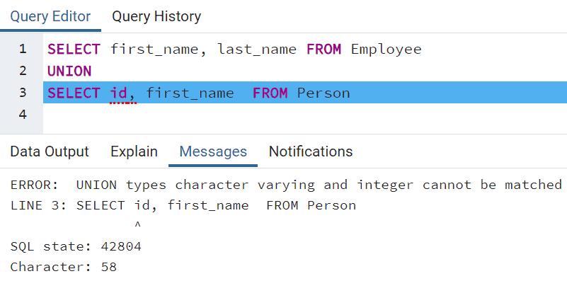 If the number of columns or types of columns is different then it will raise an error. In the following example, the first query includes two columns of character type whereas the second query includes the first column of integer type. So, it will raise an error, as shown below.